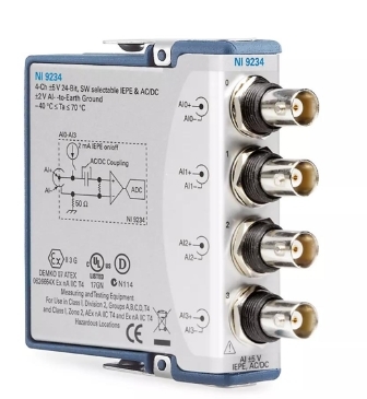 The NI 9234 is a 4-channel, 24-bit dynamic signal acquisition module optimized for sound and vibration measurements. It is compatible with CompactDAQ or CompactRIO systems, enabling integration into modular test and measurement setups. This module supports both IEPE (Integrated Electronic Piezoelectric) and non-IEPE sensors, such as accelerometers, microphones, tachometers, and proximity probes, making it suitable for applications like machinery diagnostics, structural analysis, and audio testing.